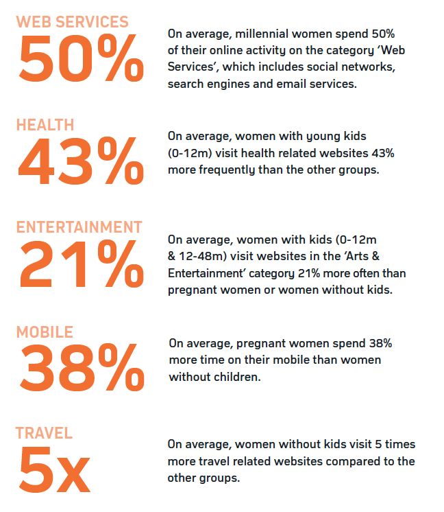 The results provide meaningful insights into behavioral differences and priorities of millennial women. The family status has a huge impact on the intensity of activity on different weekdays and specific times as well as which website categories are frequented. The detailed insights into what the different groups do online are great opportunities for brands to not only understand when it is best to connect to each segment, but also where to reach out to them most effectively.