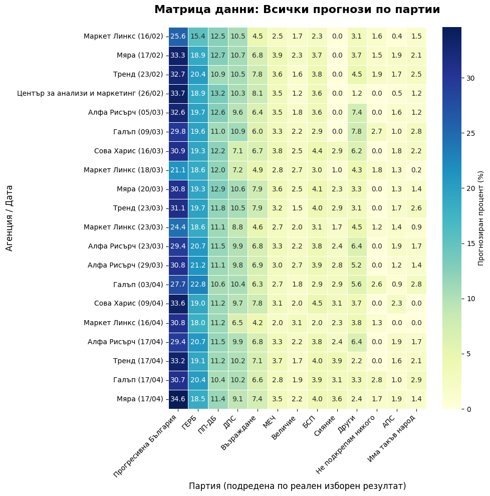 # plt.title('Матрица на данните: Всички прогнози (%)', fontsize=16, fontweight='bold')